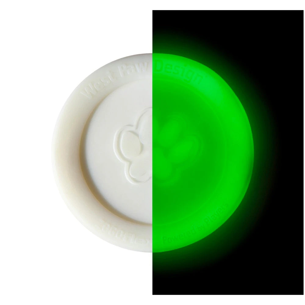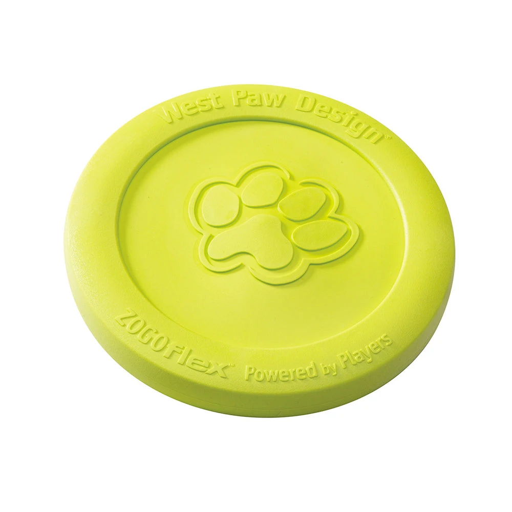 The West Paw Zisc is a durable and flexible flying disc toy for dogs made with Zogoflex material. It can be used as a water bowl when flipped over.
