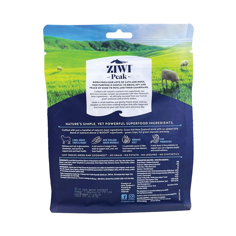 Ziwi Peak RAW Superboost for Cats is crafted with nature’s simple yet powerful superfood ingredients, just like the tried, tested and trusted Ziwi Peak Air-Dried recipes. These recipes feature free-range, grass-fed lamb, beef or venison and a blend of nutrient-dense superfoods, including cold-washed green tripe, New Zealand green lipped mussels, and organic kelp. There is 98% New Zealand meat and Superfood blend in every pack.