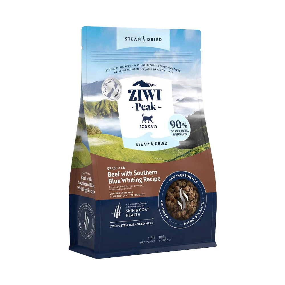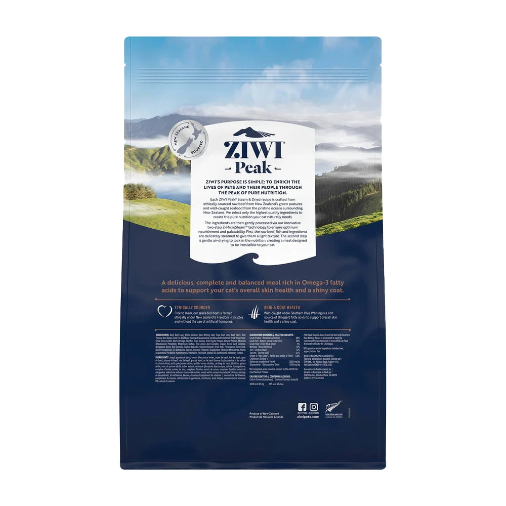 Ziwi Peak Grass-fed Beef with Southern Blue Whiting Recipe is crafted from ethically sourced raw beef from New Zealand’s green pastures and wild-caught whole Southern Blue Whiting, a rich source of Omega-3 fatty acids to support overall skin health and a shiny coat. The recipe is delicately micro-steamed then gently air-dried via an innovative two-step Z-MicroSteam technology to ensure optimum nourishment and palatability.