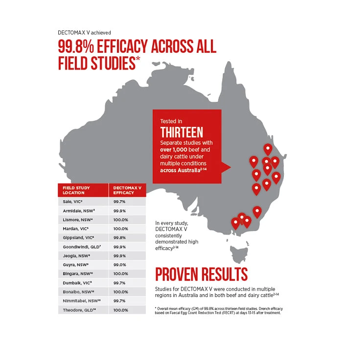 Dectomax V is an evolution from Dectomax which has been trusted and used across Australia for over 20 years. Dectomax V combines the trusted performance of doramectin, from Dectomax, with the added strength of an active called levamisole. Dectomax V provides a dual active killing power with unsurpassed efficacy against key parasites, including those often resistant to other drenches.