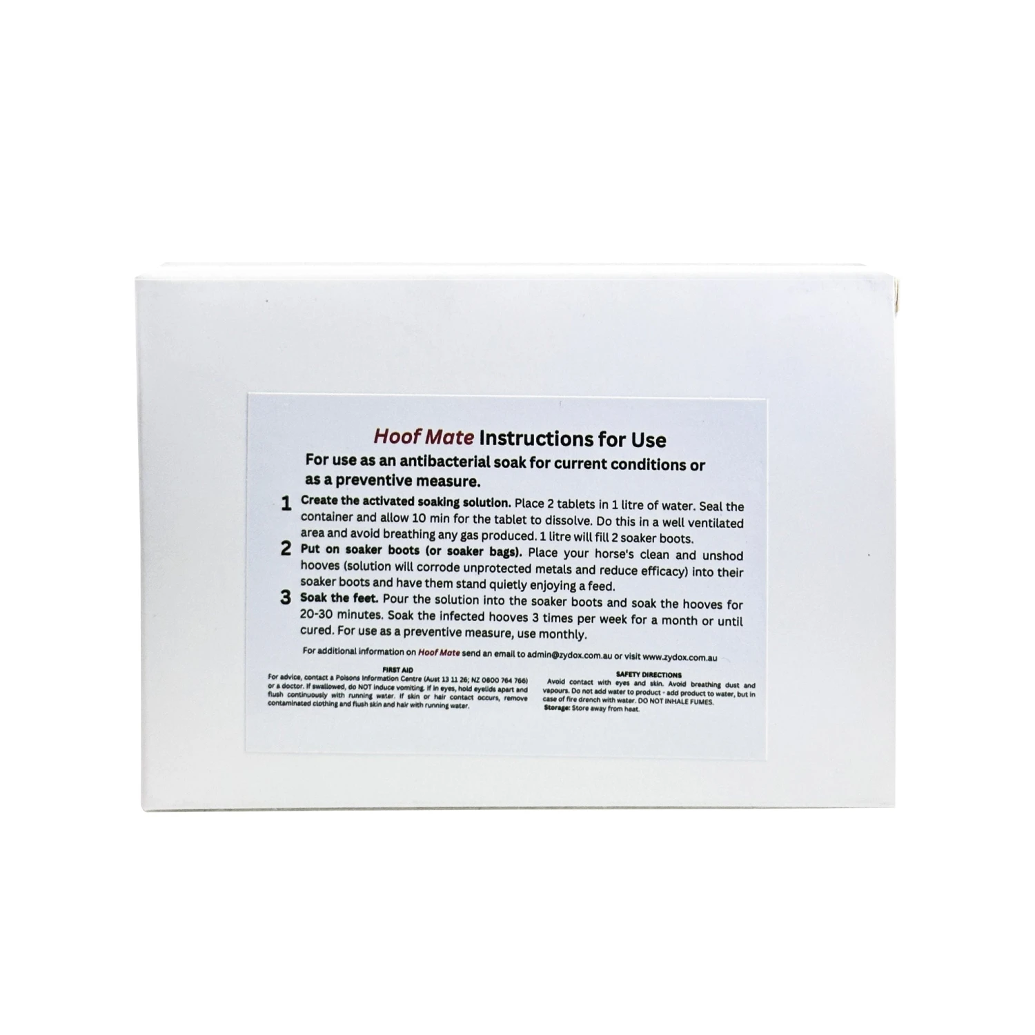 Hoof Mate are self-activating chlorine dioxide tablets that when placed in water, form a chlorine dioxide (ClO2) solution. The oxidative qualities of Cl02 are proven to potently combat bacteria, fungal and a host of other unfriendly micro-organisms with swift precision. Because it’s a liquid, it will powerfully sanitize all wound areas.